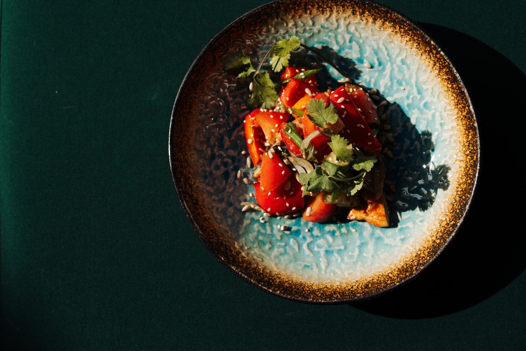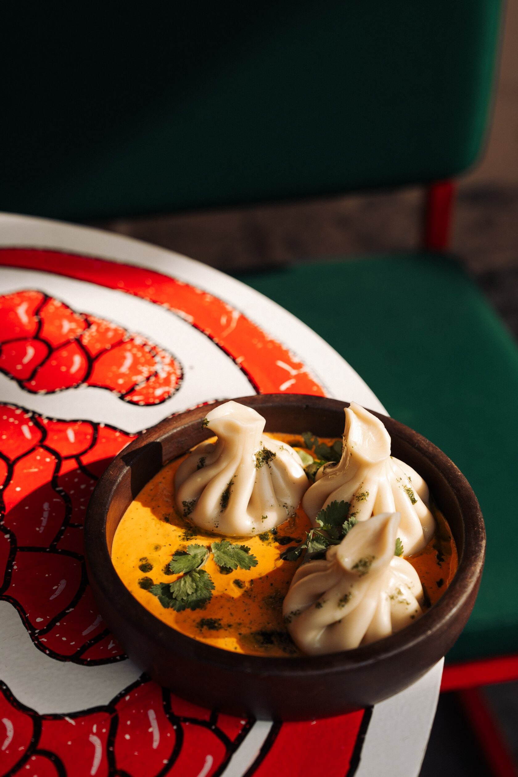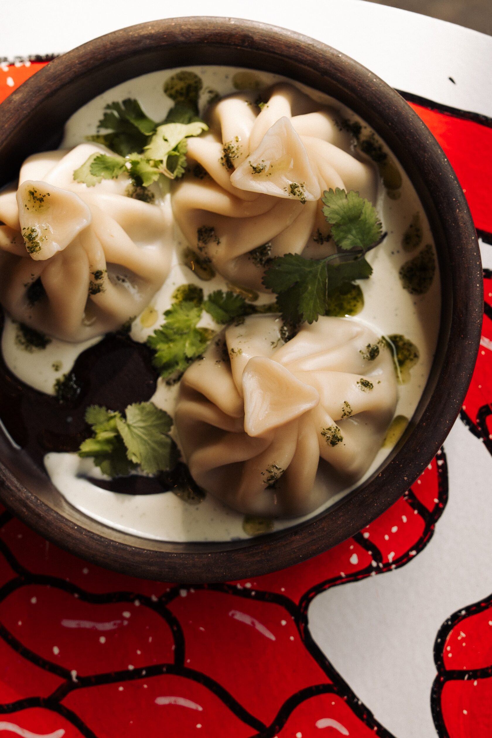 Хинкали с начинкой из печеной тыквы и творожного сыра, приправленные аджикой, мятой и тархуном. Готовые хинкали подаются с перечным соусом.
