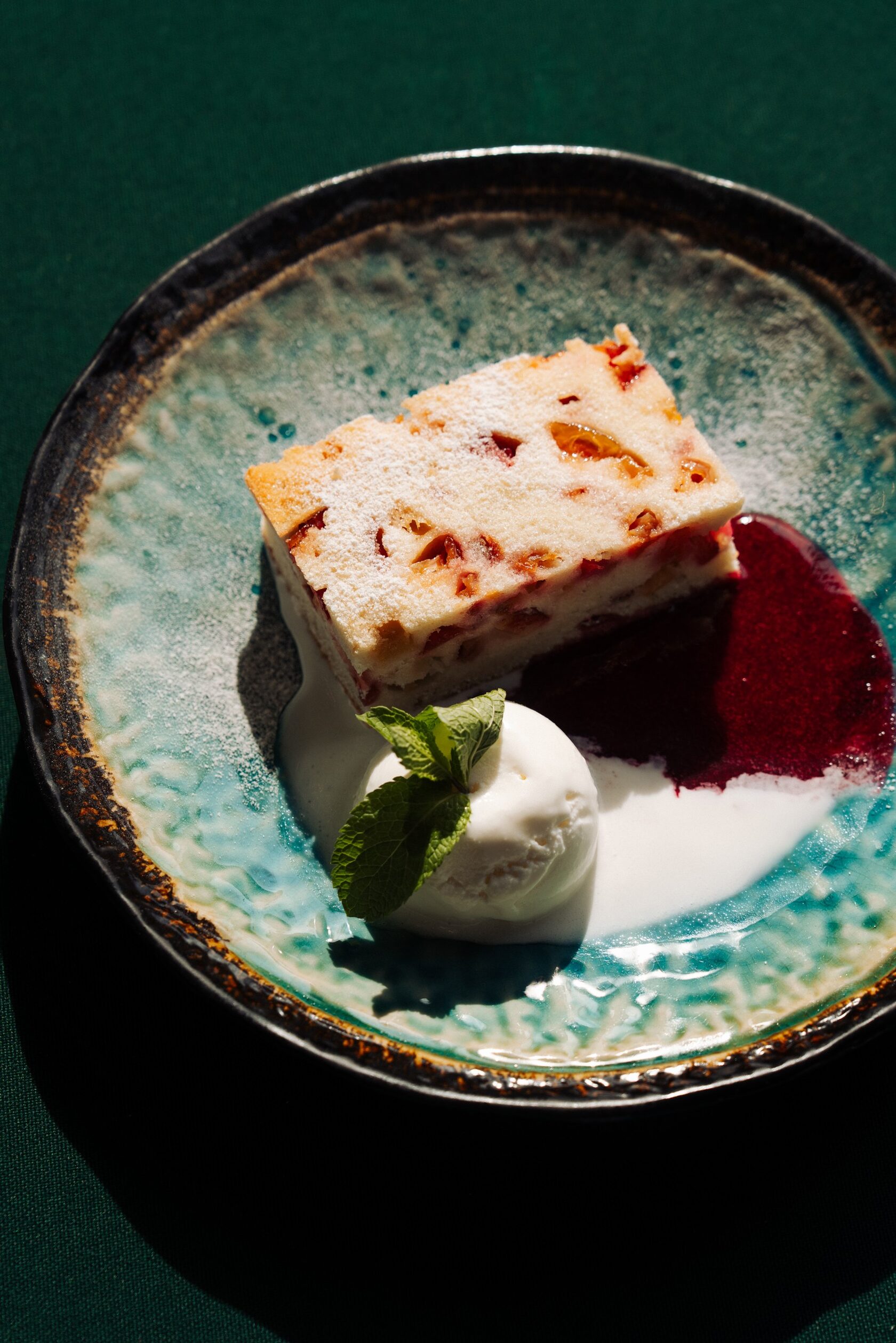 Шарлотка со свежей сливой, придающей легкую кислинку десерту. Подается с шариком мороженого и поливается вишневым соусом, посыпается сахарной пудрой и украшается мятой.