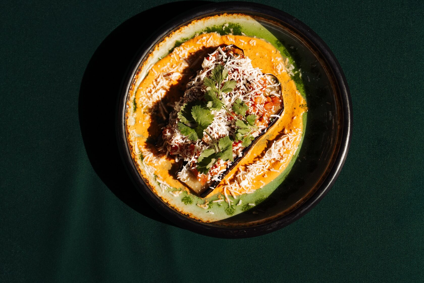 Запеченный баклажан, подается на подушке из насыщенного перечного соуса, приготовленного из сладкого запеченного перца. К нему добавляются еще три соуса (отсюда и 4.0. в названии блюда): острая аджика, свежая сальса и ароматный чими чури, посыпается всё копченым сулугуни и украшается зеленью.